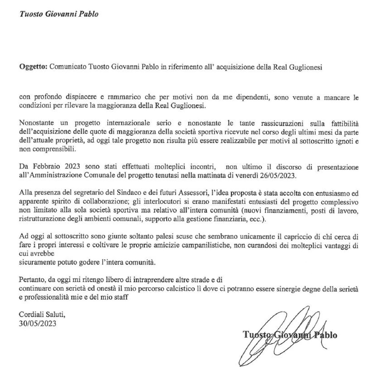 Comunicato ufficiale Gianni Tuosto